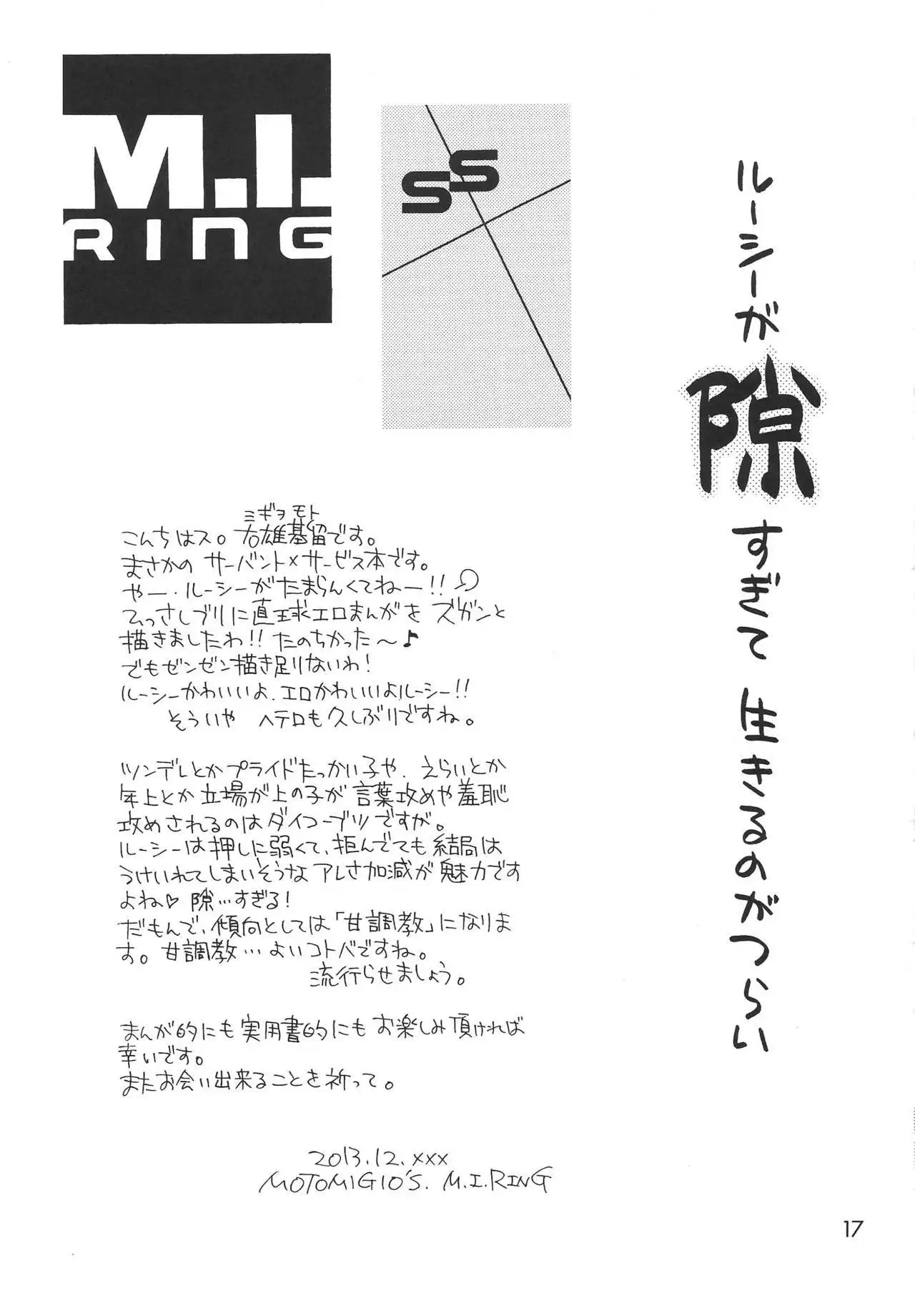 (C85) [M.I.RING (Migio Moto)] Lucy ga Sukisugite Ikiru no ga Tsurai + Omake (Servant x Service)